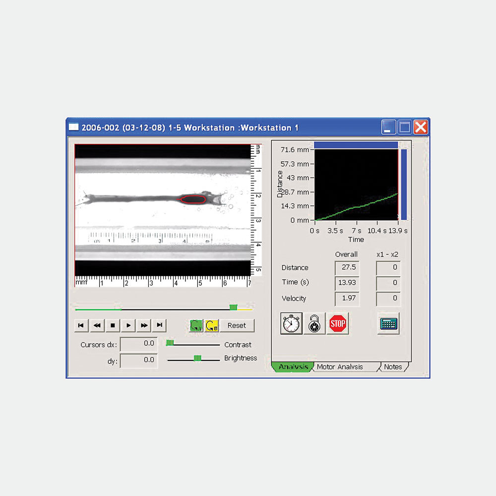 - The analysis screen is used during spatially calibrated video playback, and provides a cumulative record of velocity (distance x time) The raw data can be examined to determine if the motility rate was consistent (a linear graph), or changes over time (a curved graph).
