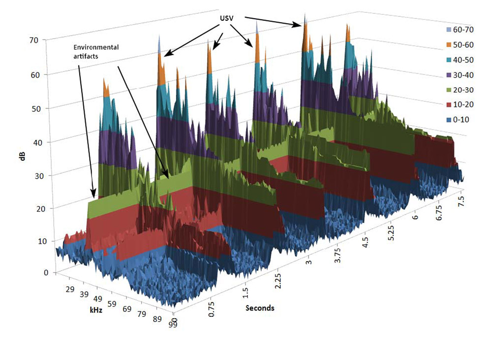 A three-dimensional surface plot that illustrates frequency (in kHz) by time and amplitude (in dB). Particularly useful for revealing ultrasonic artifacts in the testing environment, such as ultrasonic vibrations created by some fluorescent lamps or computer monitors. Once artifacts are recognized, the bandwidth can be adjusted to isolate USVs from other ultrasonic events.