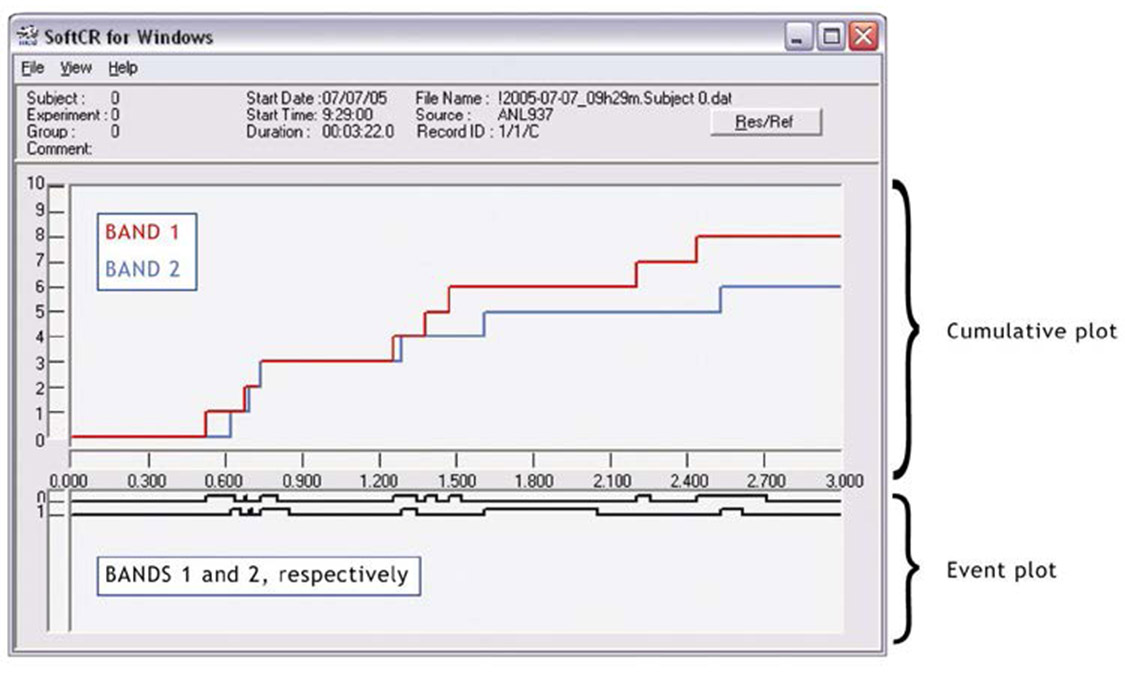 Data can be viewed as an event plot or in a cumulative fashion to represent the rate of USV occurrences as a method of estimating the rate of USV occurrences. Each occurrence of an ultrasonic vocalization causes an increase on Med-PC®’s SoftCR Pro® cumulative plot.